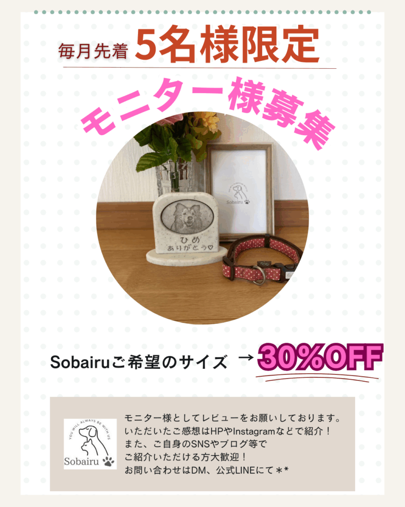 いつまでも変わらない愛情と感謝の気持ちが、あなたの心から大切なペットに届きますように。Sobairuは、そんな温かい絆を守り続けるお手伝いをさせていただきます。